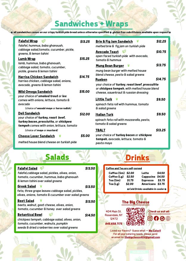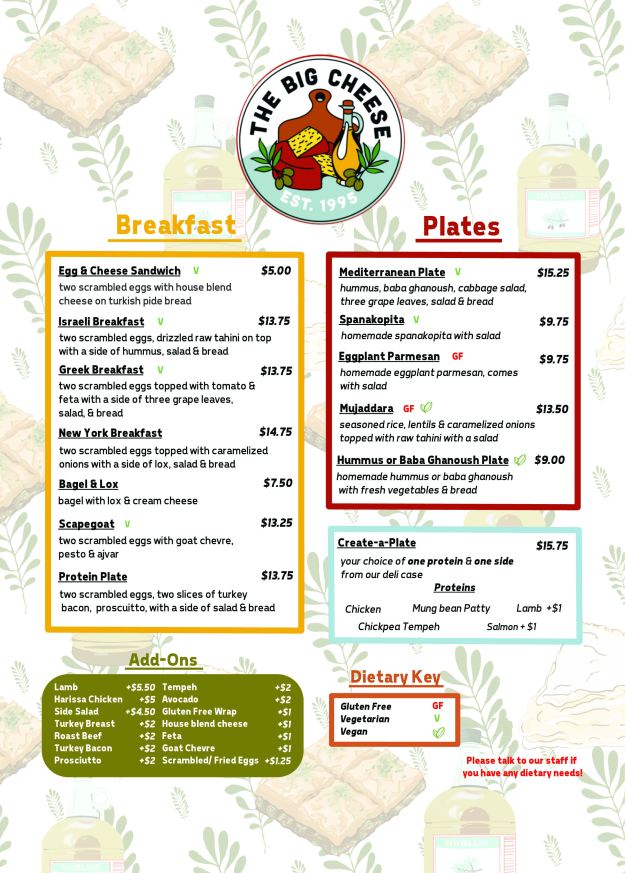 The Big Cheese would be delighted to cater your next event. Artistically presented cheese platters, hors d-oeuvres, sandwich platters and authentic Mediterranean foods.